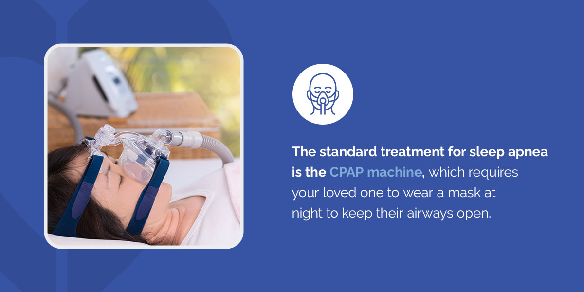 The standard treatment for sleep apnea is the CPAP machine, which requires your loved one to wear a mask at night to keep their airways open. The newer machines are quieter, more comfortable and help to reduce and even eliminate many of the common symptoms of sleep apnea. Your loved one may need help getting their machine set up to maximize comfort while they get used to CPAP. You should ensure they use it every night to see the improved effects on sleep quality and cognitive function. A CPAP machine needs regular cleaning. Ask your healthcare provider for the specific instructions on how to do this properly.