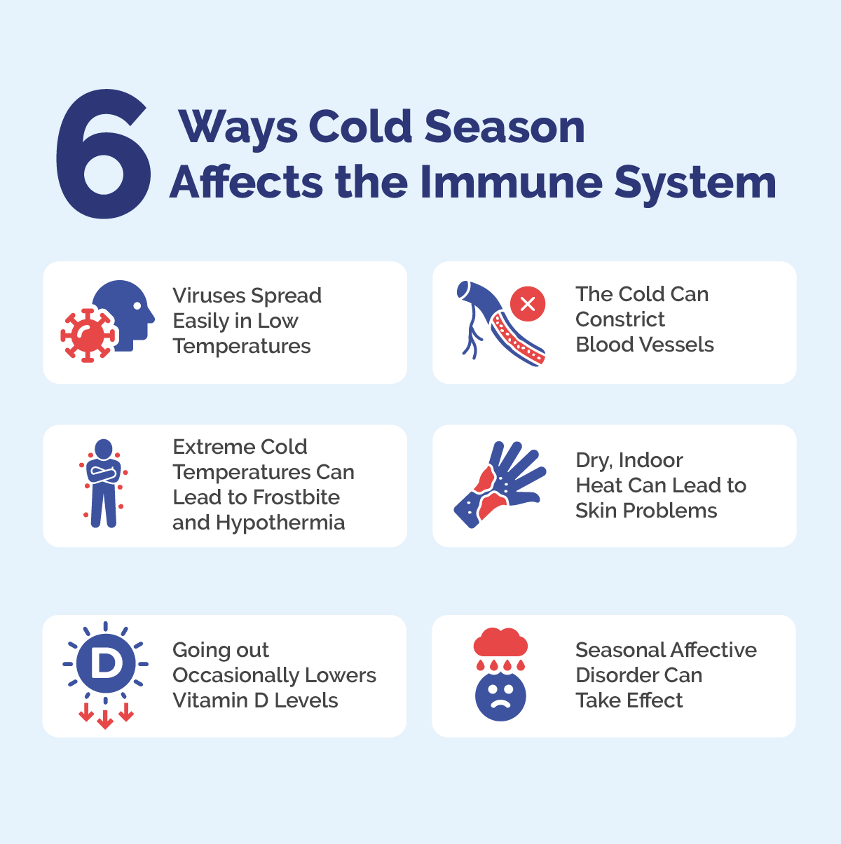Winter can be a fun-filled holiday season. However, the cold temperature also makes everyone, especially immunocompromised seniors, susceptible to viruses, such as the common cold and flu. A weakened immune system makes you sick more often, and your illness lasts longer. You also have a higher risk of complications, such as pneumonia or bacterial infections.